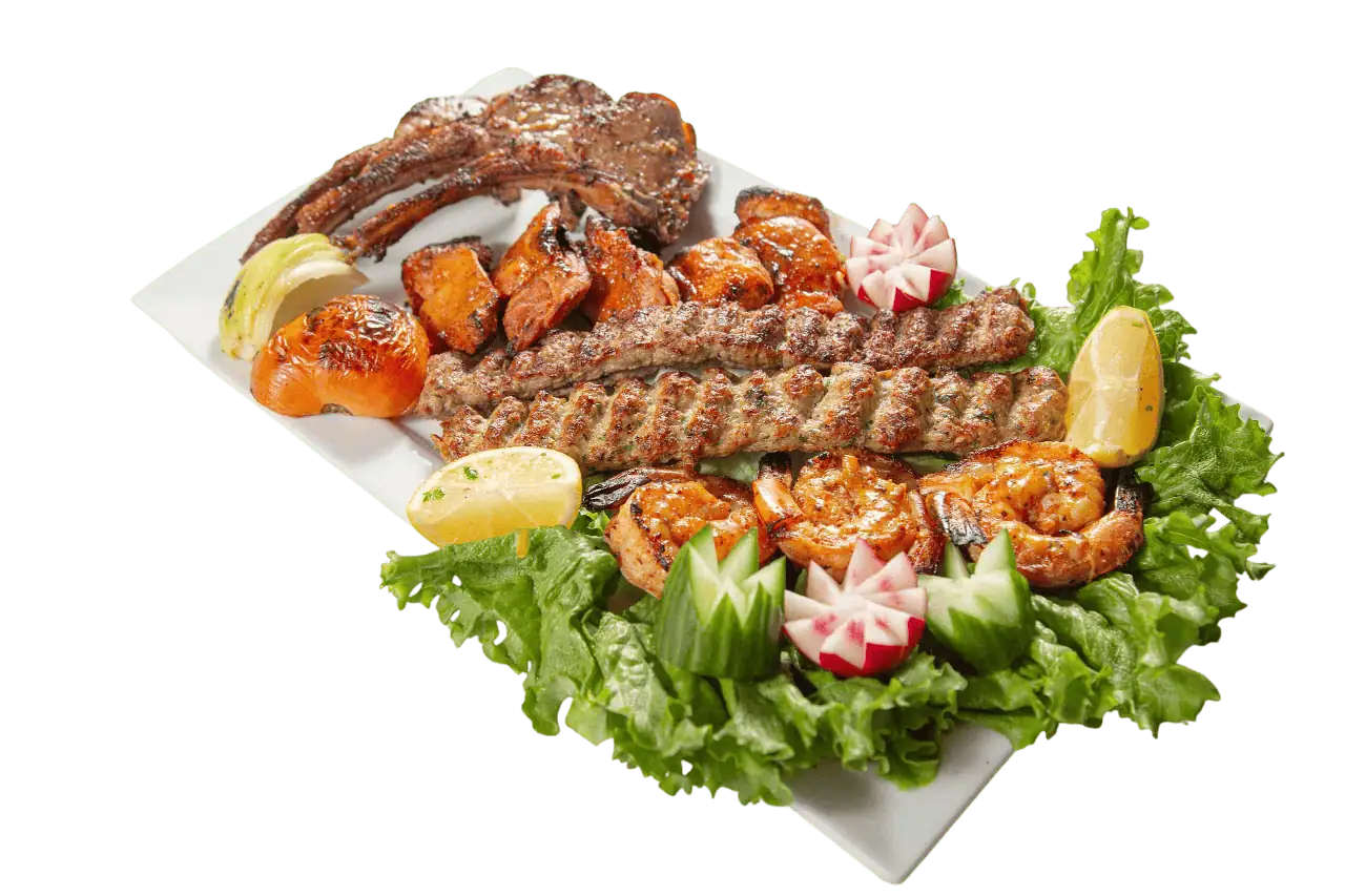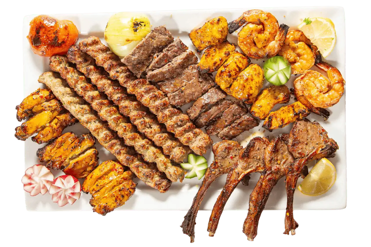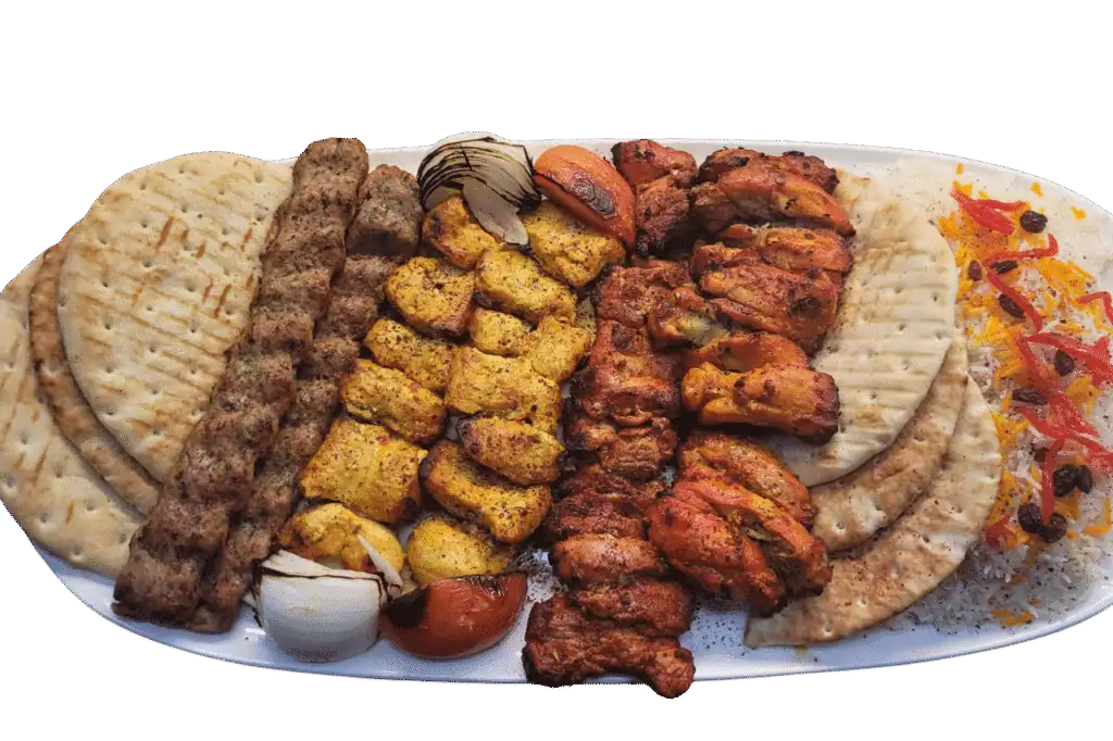 Two skewers of each: chicken kobideh, joojeh kebab & crazy chicken.