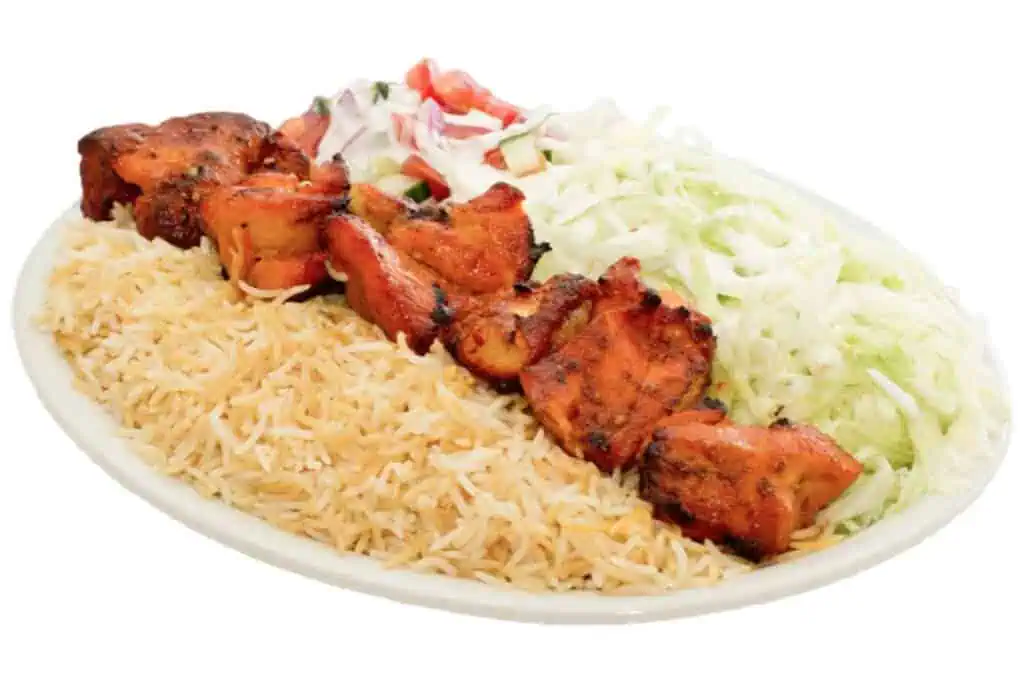 One skewer of chicken thigh chunks prepared in a spicy tikka marinade