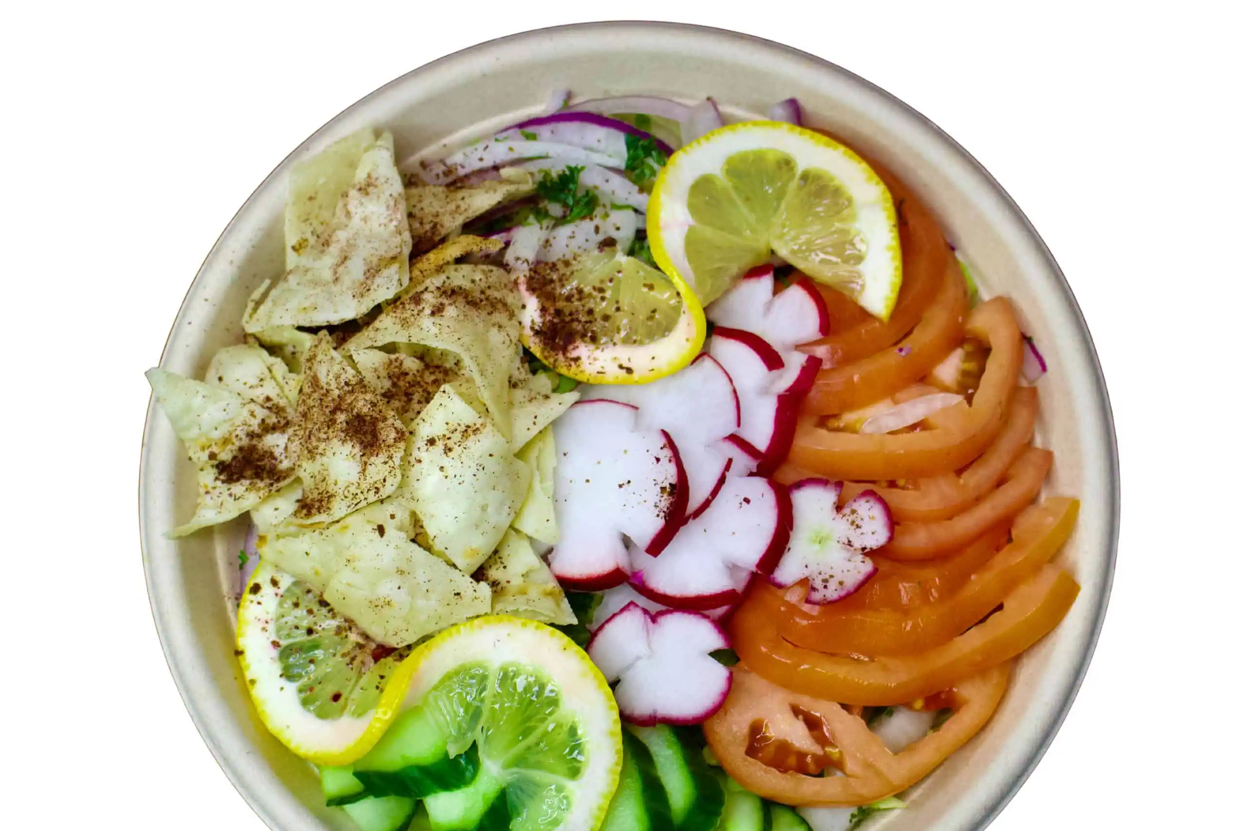 Lettuce, onions, tomatoes, cucumbers, turnips, pickles, and red cabbage.