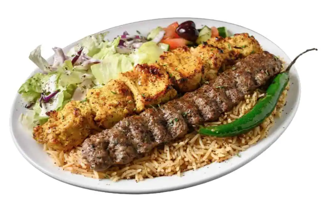 One joojeh skewer and one ground beef skewer